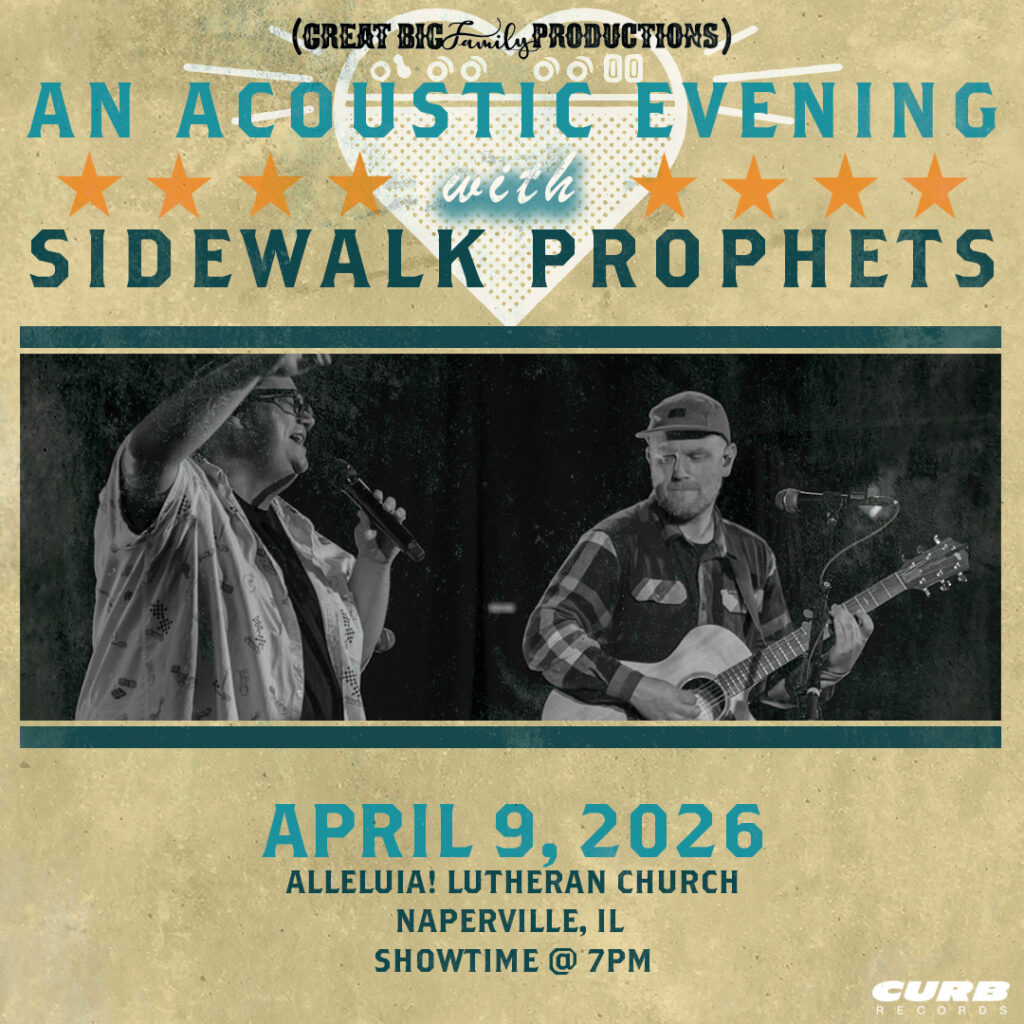 The concert will be at 7pm Thursday, April 9th at Alleluia! Lutheran Church, 4055 S. Book Road, Naperville. Tickets are on sale now and expected to sell fast. Tickets are $20 each, plus fees, with options for early entry and VIP access. Visit sidewalkprophets.com for tickets.